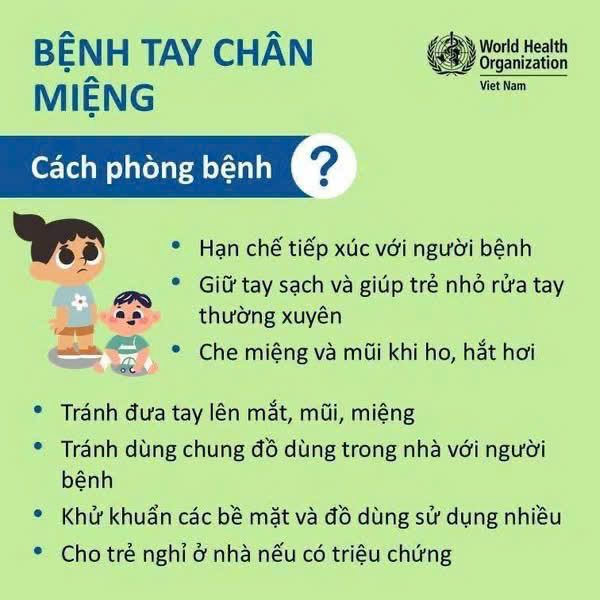 ⚠️ CẢNH GIÁC VỚI BỆNH TAY CHÂN MIỆNG! ⚠️ Bệnh Tay Chân Miệng đang vào mùa. Đừng chủ quan vì bệnh lây lan rất nhanh qua tiếp xúc và đường tiêu hóa. Hiện bệnh CHƯA CÓ VẮC-XIN phòng ngừa. Hãy cùng Trạm Y tế phường “bỏ túi” ngay những kiến thức quan trọng này nhé: 🔍 DẤU HIỆU NHẬN BIẾT: Trẻ sốt (>37.5°C), đau họng, biếng ăn. Loét miệng, gây đau rát khiến trẻ quấy khóc, bỏ ăn. Nổi nốt phỏng nước ở các vị trí đặc trưng: Lòng bàn tay, lòng bàn chân, đầu gối, vùng mông. 🛡️ PHÒNG BỆNH HƠN CHỮA BỆNH: ✅ Rửa tay thường xuyên bằng xà phòng (cả người chăm sóc và trẻ). ✅ Khử khuẩn đồ chơi, bề mặt bàn ghế, sàn nhà. ✅ Che miệng khi ho/hắt hơi; không dùng chung đồ cá nhân. ✅ Nếu trẻ có dấu hiệu bệnh, hãy cho trẻ nghỉ học và ở nhà theo dõi. 💊 ĐIỀU TRỊ ĐÚNG CÁCH: ❌ KHÔNG tự ý dùng kháng sinh (vì bệnh do virus gây ra). ✅ Cho trẻ uống nhiều nước, ăn đồ mềm/nguội. ✅ Theo dõi sát sao, đưa trẻ đến cơ sở y tế ngay nếu triệu chứng không giảm sau 10 ngày hoặc có dấu hiệu chuyển nặng. 📸 Xem chi tiết hướng dẫn từ WHO trong các hình ảnh dưới đây!