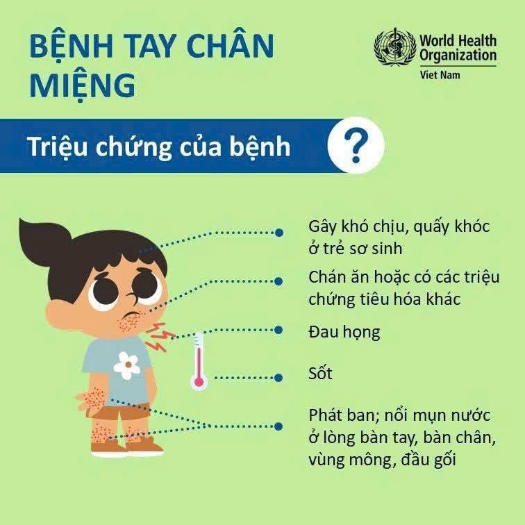 ⚠️ CẢNH GIÁC VỚI BỆNH TAY CHÂN MIỆNG! ⚠️ Bệnh Tay Chân Miệng đang vào mùa. Đừng chủ quan vì bệnh lây lan rất nhanh qua tiếp xúc và đường tiêu hóa. Hiện bệnh CHƯA CÓ VẮC-XIN phòng ngừa. Hãy cùng Trạm Y tế phường “bỏ túi” ngay những kiến thức quan trọng này nhé: 🔍 DẤU HIỆU NHẬN BIẾT: Trẻ sốt (>37.5°C), đau họng, biếng ăn. Loét miệng, gây đau rát khiến trẻ quấy khóc, bỏ ăn. Nổi nốt phỏng nước ở các vị trí đặc trưng: Lòng bàn tay, lòng bàn chân, đầu gối, vùng mông. 🛡️ PHÒNG BỆNH HƠN CHỮA BỆNH: ✅ Rửa tay thường xuyên bằng xà phòng (cả người chăm sóc và trẻ). ✅ Khử khuẩn đồ chơi, bề mặt bàn ghế, sàn nhà. ✅ Che miệng khi ho/hắt hơi; không dùng chung đồ cá nhân. ✅ Nếu trẻ có dấu hiệu bệnh, hãy cho trẻ nghỉ học và ở nhà theo dõi. 💊 ĐIỀU TRỊ ĐÚNG CÁCH: ❌ KHÔNG tự ý dùng kháng sinh (vì bệnh do virus gây ra). ✅ Cho trẻ uống nhiều nước, ăn đồ mềm/nguội. ✅ Theo dõi sát sao, đưa trẻ đến cơ sở y tế ngay nếu triệu chứng không giảm sau 10 ngày hoặc có dấu hiệu chuyển nặng. 📸 Xem chi tiết hướng dẫn từ WHO trong các hình ảnh dưới đây!